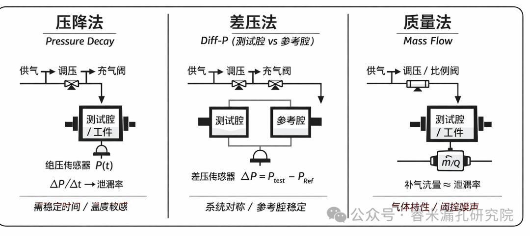 典型短板 | 易把回弹当泄漏;大容积/塑料件吃亏 | 参考腔不等效会引入新误差 | 稳态没做好等于白测;阀控/算法要求高 |
