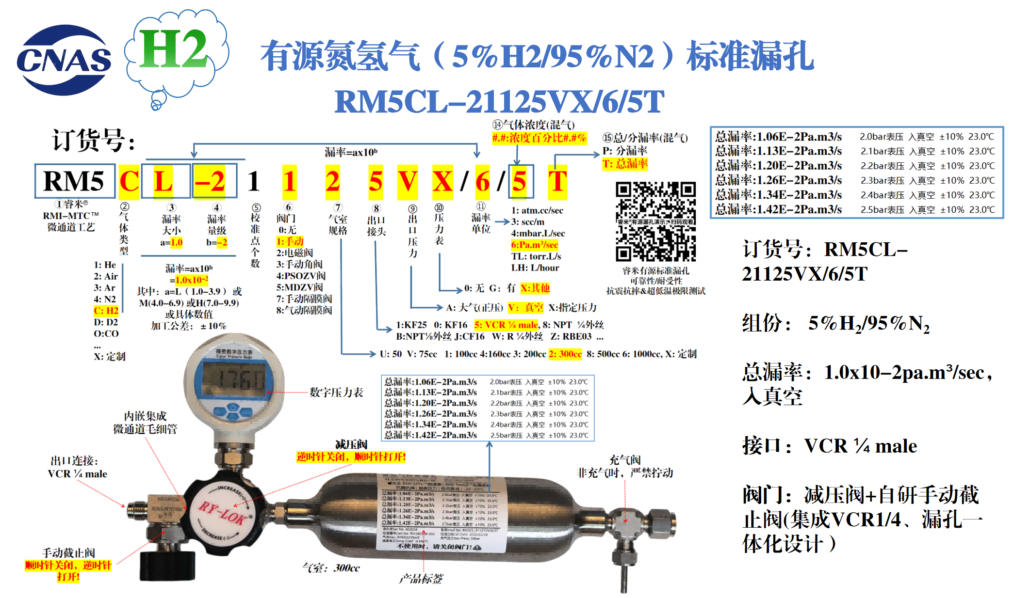 气体5%H2/95%N2;总漏率:1.0x10-2pa.m³/sec,入真空;气室300cc;充气压力~5MPa;出口连接:VCR ¼ male;减压阀(减压至0.4Mpa左右)+睿米®自研手动截止阀(集成VCR1/4、漏孔一体化设计)  注意:减压阀调压时,顺时针缓慢打开阀门,到指定压力后,停止;待测试完成后,逆时针关闭减压阀(可长期保存)。衰减:可持续使用24小时以上,提供压力-漏率对应表。