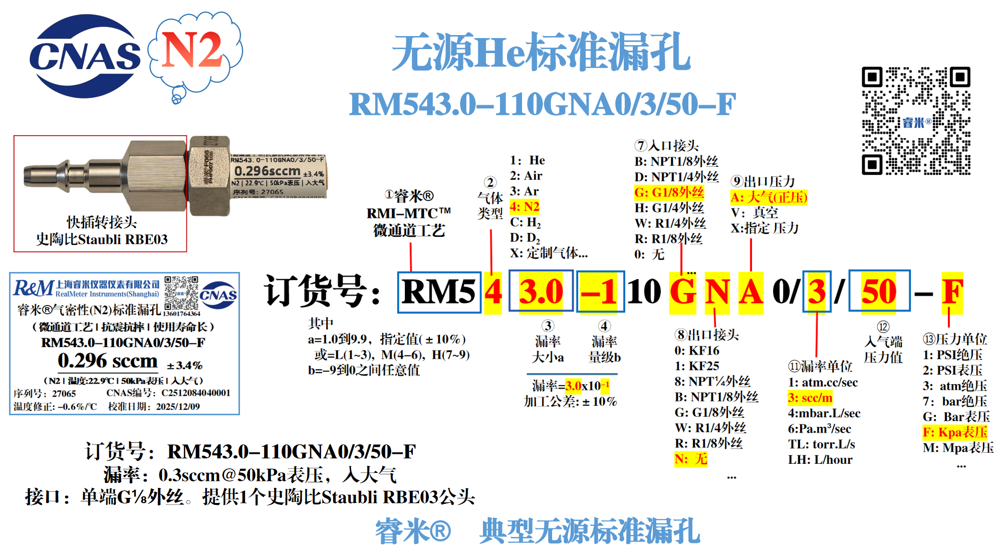 睿米公司的无源标准漏孔,采用自研RMI-MTC™微通道毛细管技术,配合自研RMI-Cal™气体物质属性、流导模拟/仿真算法,可以做到根据用户的要求进行精确定制: