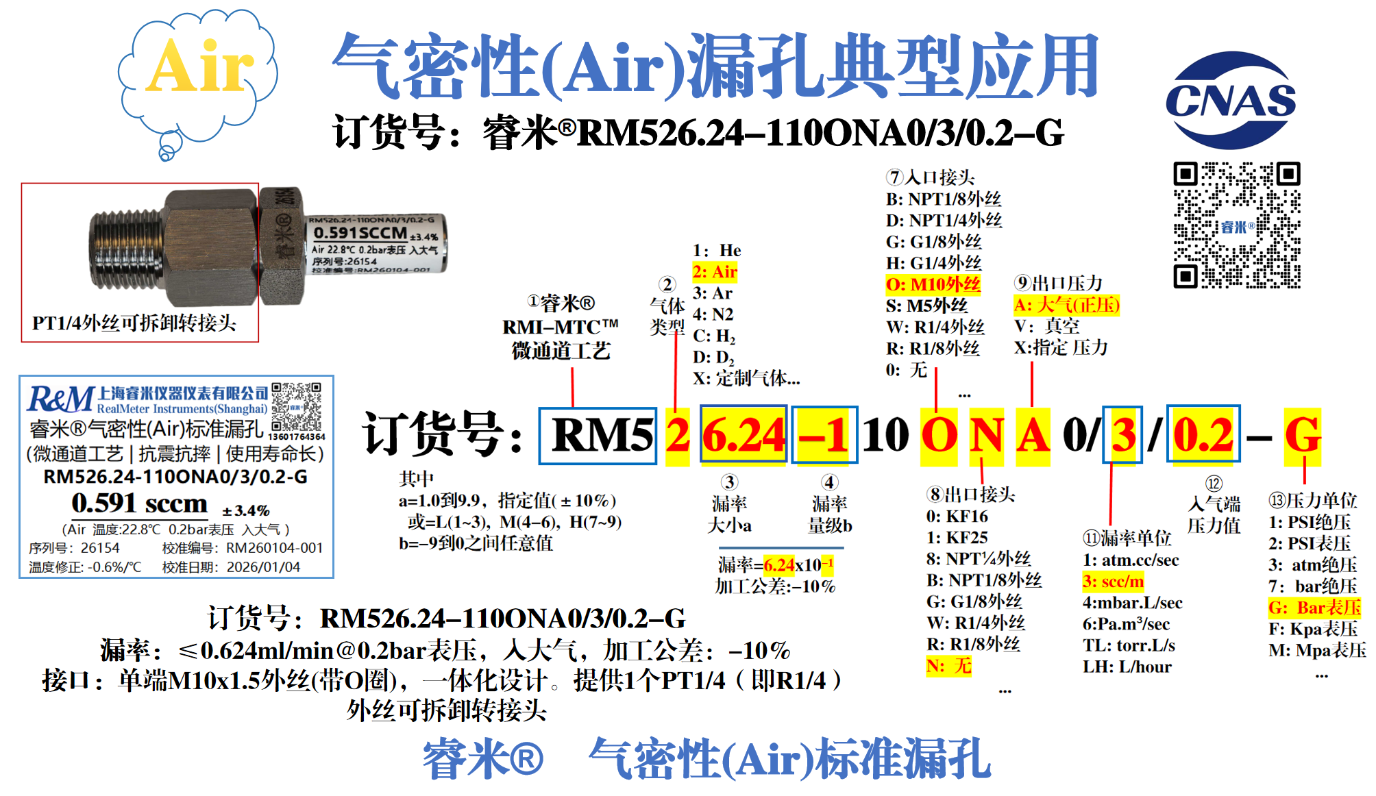 订货号:睿米®RM526.24-110ONA0/3/0.2-G【说明:≤0.624ml/min@0.2bar表压,入大气,加工公差:-10%;接口类型,单端M10x1.5外丝(带O圈),一体化设计。无需拼接和胶水,杜绝泄漏,漏率无方向性,提供1个PT1/4(即R1/4)外丝可拆卸转接头。规格尺寸:~长38mm (~长58mm,连接1个PT1/4(即R1/4)外丝可拆卸转接头)】