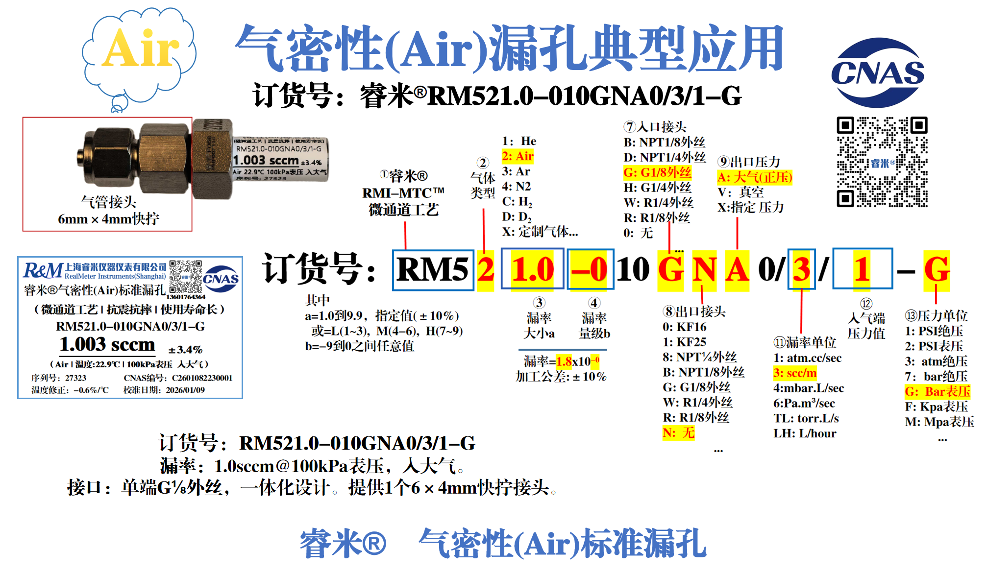 订货号:睿米®RM521.0-010GNA0/3/1-G【说明:1.0sccm@100kPa表压,入大气;接口类型,单端G⅛外丝,一体化设计。无需拼接和胶水,杜绝泄漏,漏率无方向性。提供1个6×4mm快拧接头。规格尺寸:~长38mm (~长57mm,连接6×4mm快拧气管接头)】