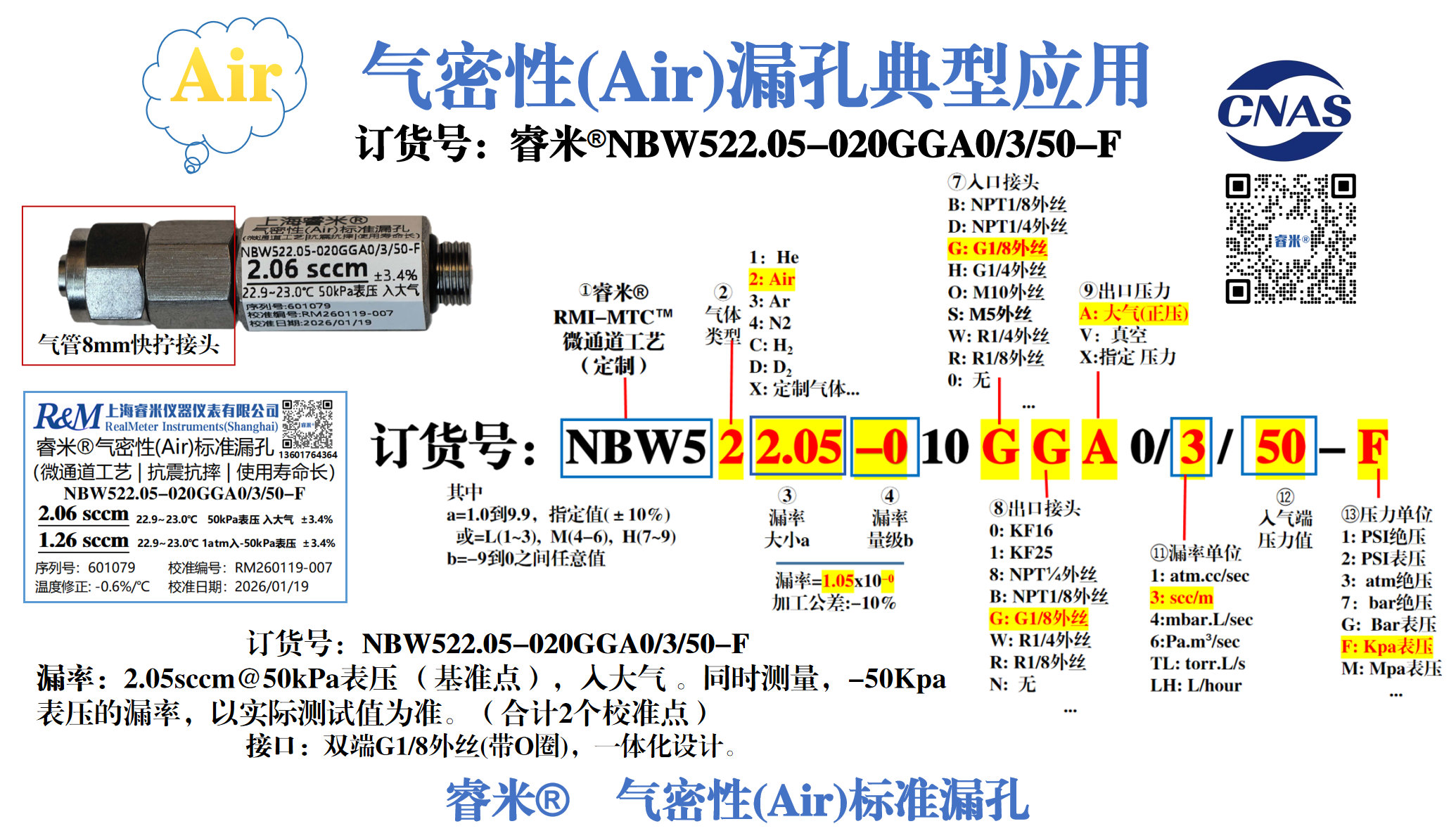 订货号:睿米®NBW522.05-020GGA0/3/50-F【说明:2.05sccm@50kPa表压 (基准点),入大气,加工公差:±5%。同时测量,-50Kpa表压的漏率,以实际测试值为准。(合计2个校准点);接口类型,双端G1/8外丝(带O圈),一体化设计, 无需拼接和胶水,杜绝泄漏,漏率无方向性。提供1个8mm快拧接头。规格尺寸:~长38mm (~长58mm,连接1个8mm快拧接头)】