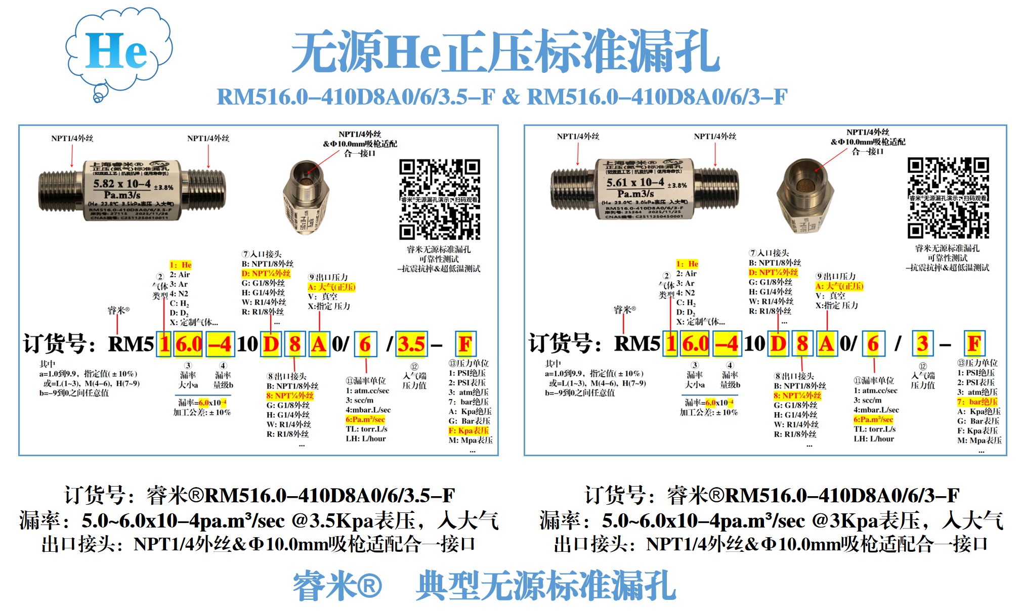 睿米 ® 典型无源He正压标准漏孔: