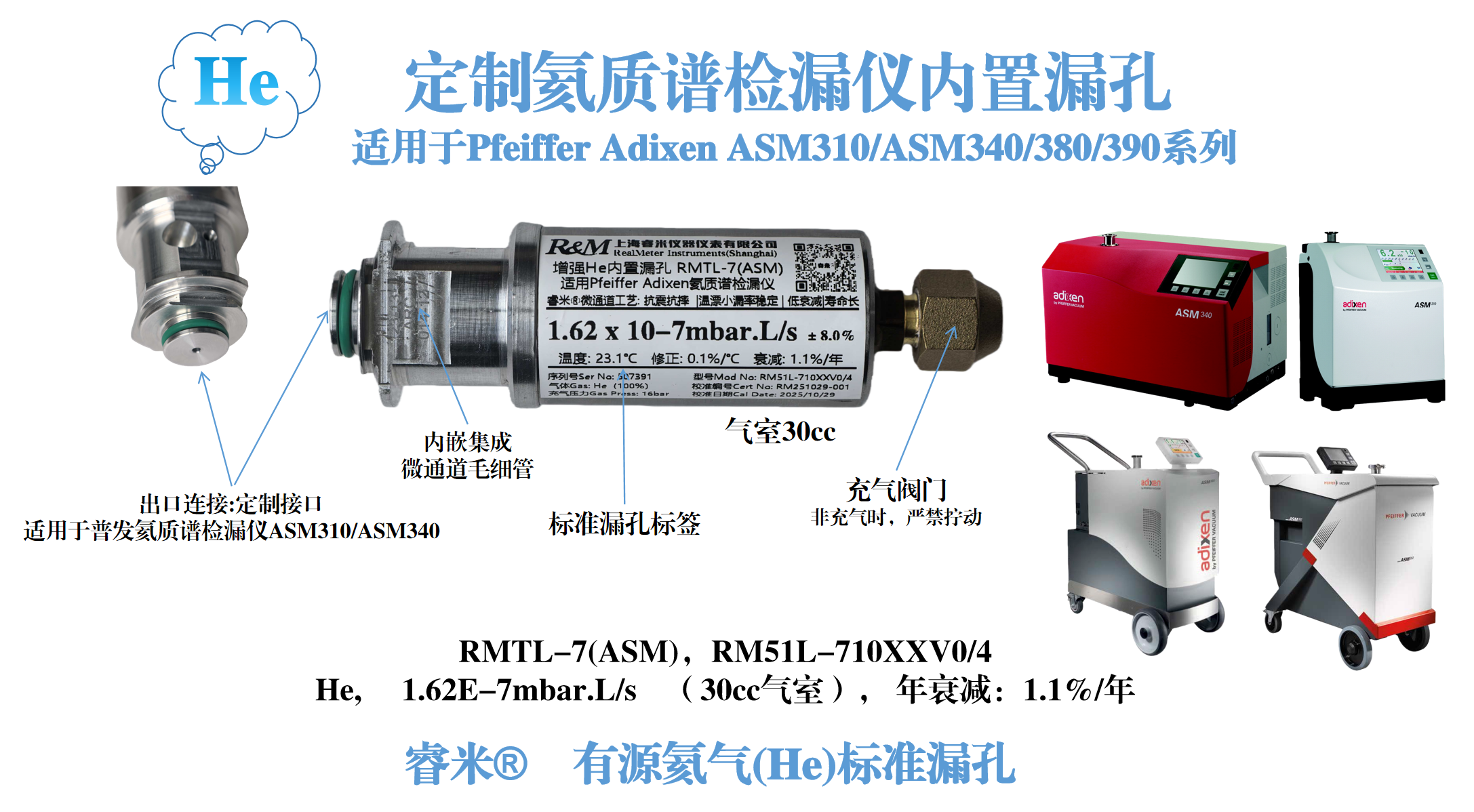 这是专门为普发氦质谱检漏仪ASM310/ASM340/380/390系列,定制的内置标准漏孔。普发氦质谱检漏仪ASM310/ASM340/380/390系列连接的接口是定制。另外利用睿米公司的技术优势,采用微通道毛细管技术,气室内的氦气压力高,年衰减低,使用寿命更长;温度敏感性小,随温度变化的温漂系数0.1%/℃,标准漏孔的漏率值更稳定。