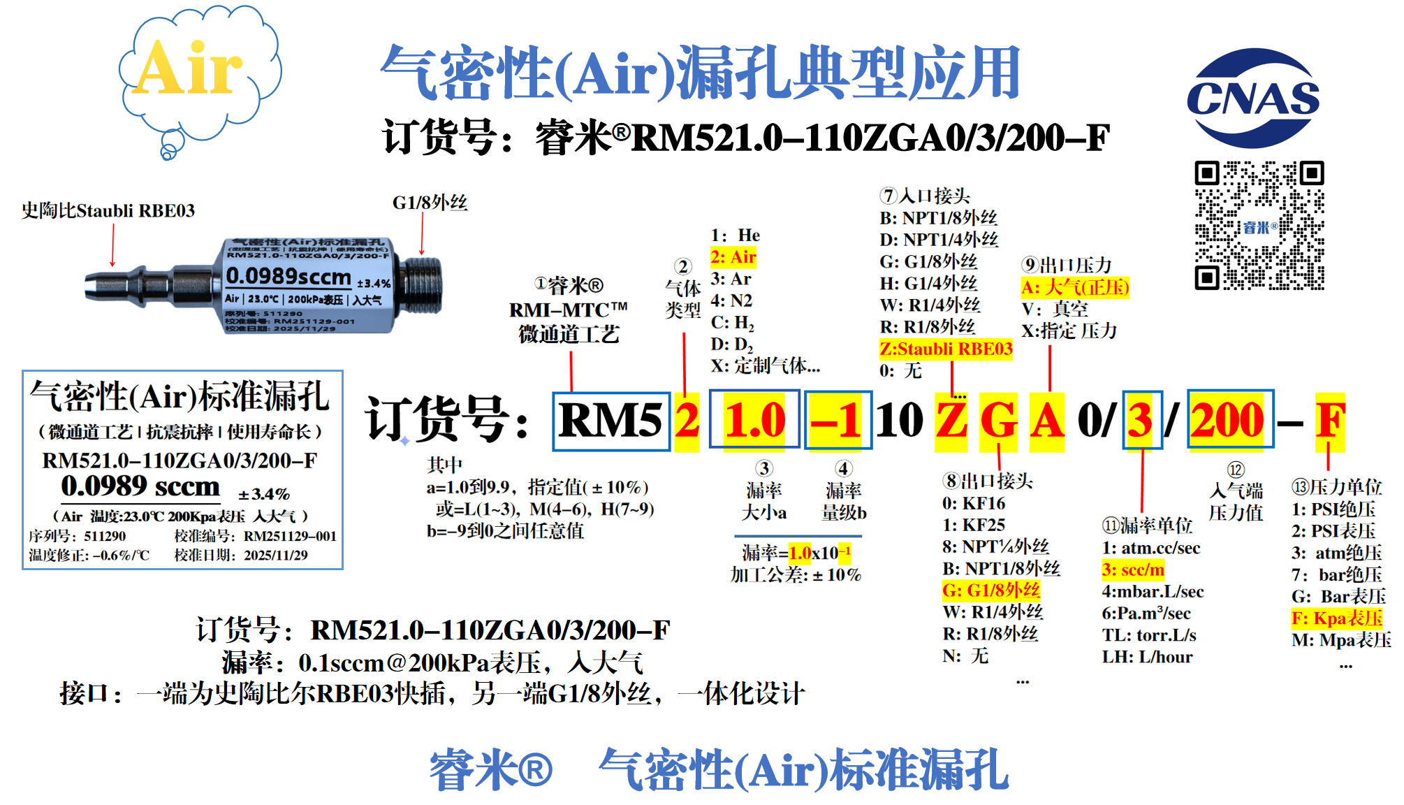 以下是睿米公司为某用户定制的气密性标准漏孔,典型案例: