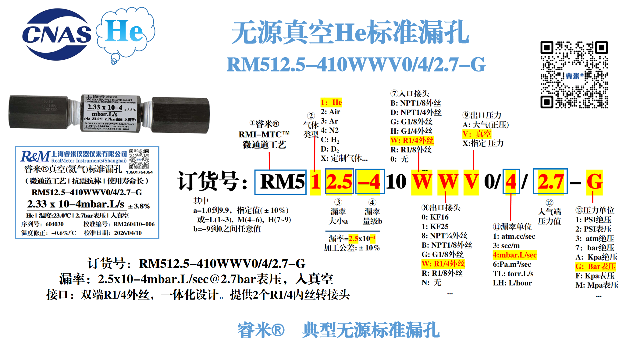 睿米 ® 典型无源He标准漏孔: