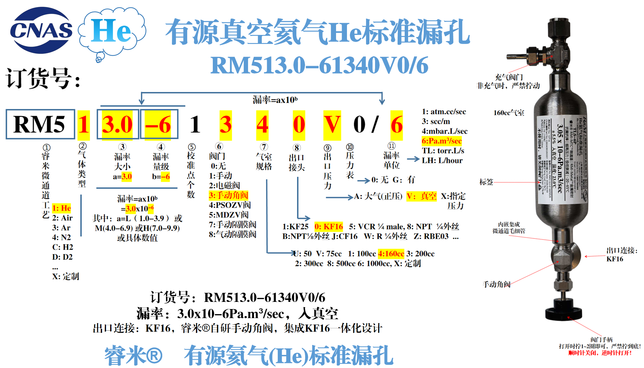说明:气体氦气(He);漏率:3.0x10-6Pa.m³/sec,入真空;加工公差:-10%