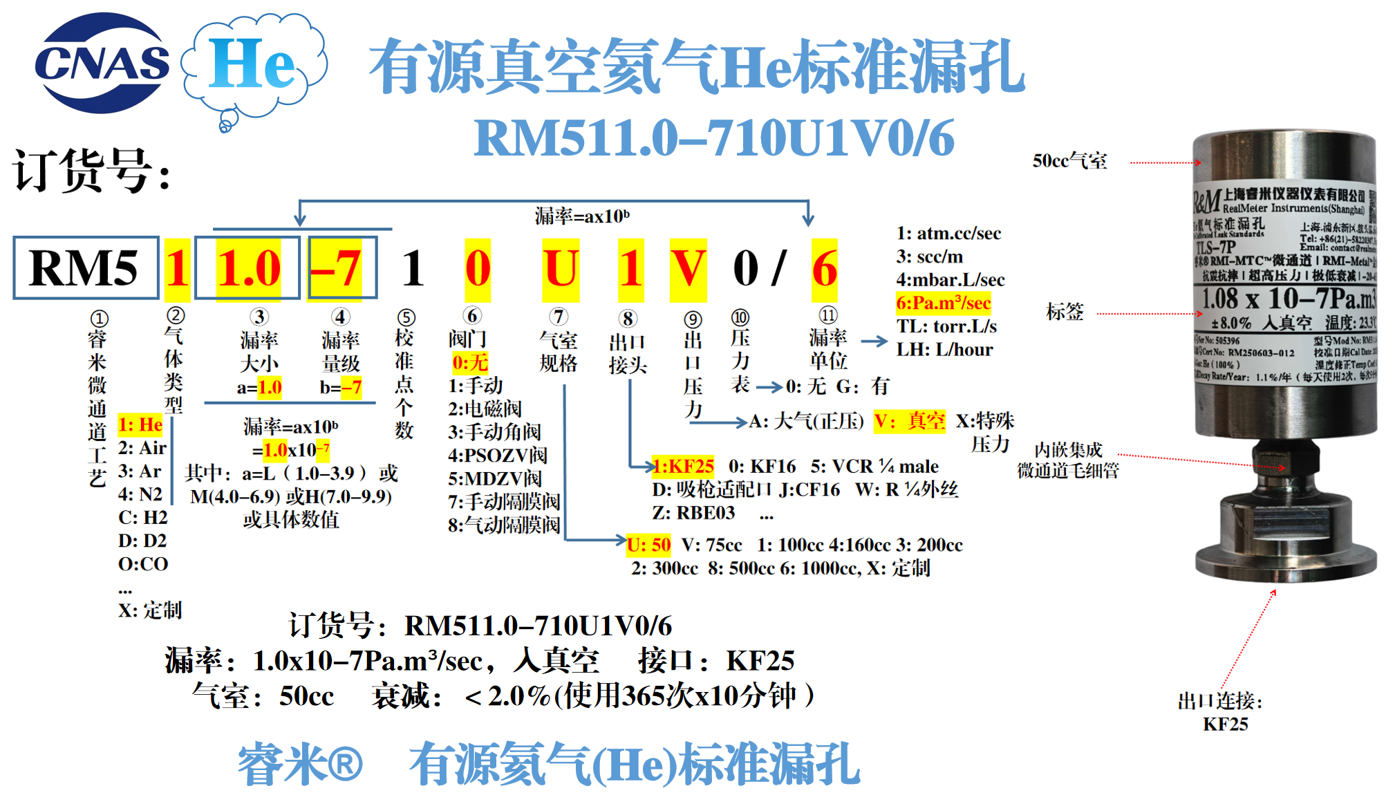 说明:气体氦气(He);漏率:1.0x10-7Pa.m³/sec ,入真空;气室50cc;无阀门;出口连接KF25;年衰减:<2.0%(使用365次x10分钟)。