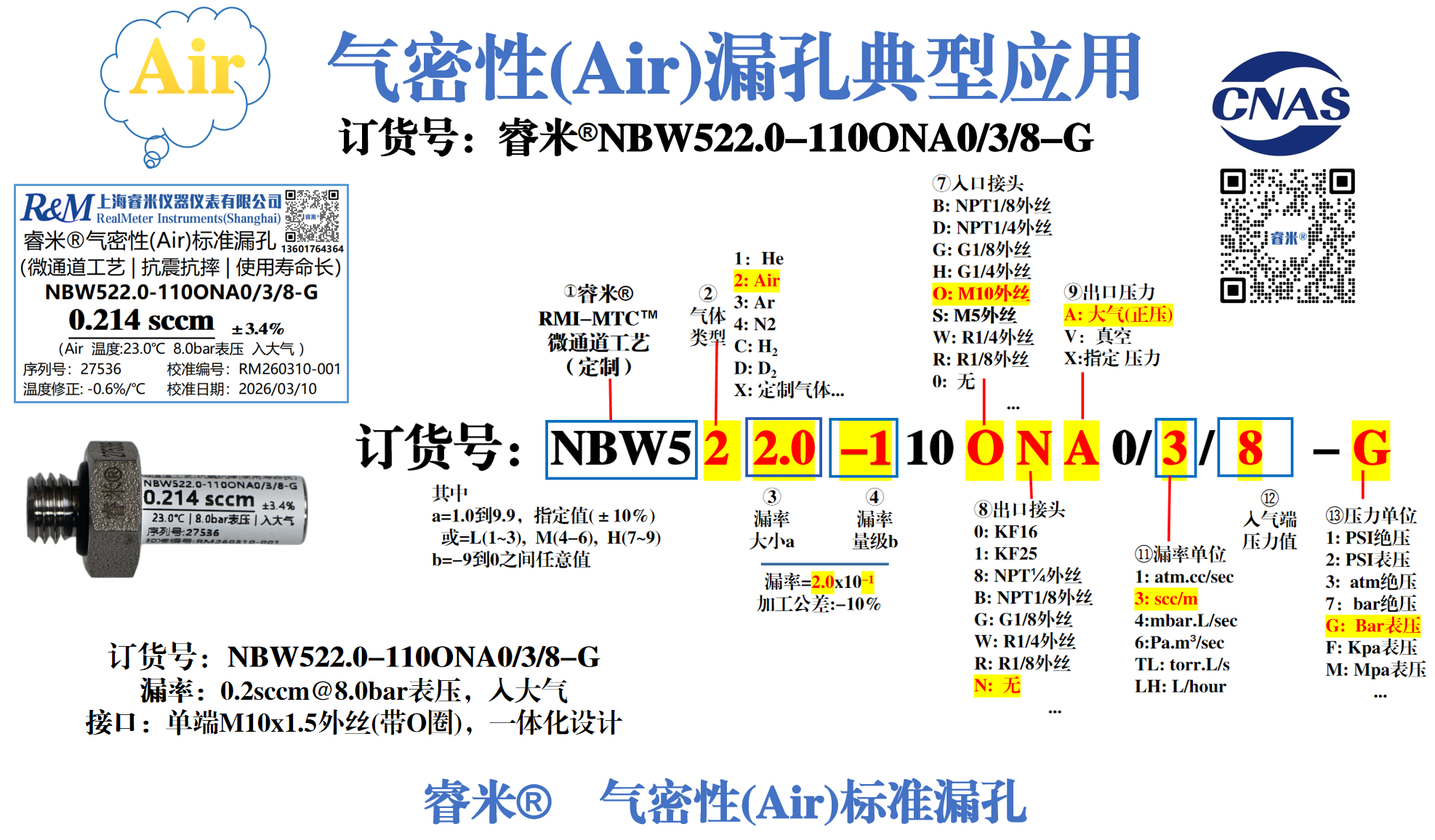 订货号:睿米®NBW522.0-110ONA0/3/8-G【漏率:0.2sccm@8.0bar表压,入大气,加工公差:±10%;接口类型,单端M10x1.5外丝(带O圈),一体化设计, 无需拼接和胶水,杜绝泄漏,漏率无方向性。规格尺寸:~长38mm  】