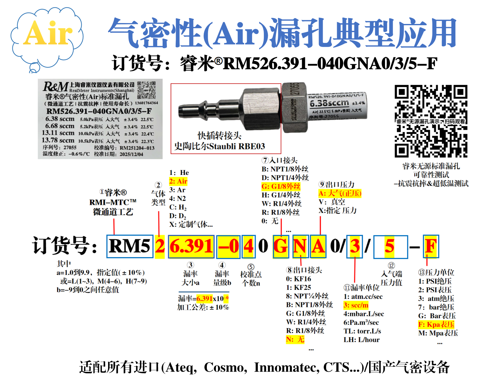 睿米公司的标准漏孔,采用自研RMI-MTC™微通道毛细管技术,配合自研RMI-Cal™气体物质属性、流导模拟/仿真算法,可以做到根据用户的要求进行精确定制: